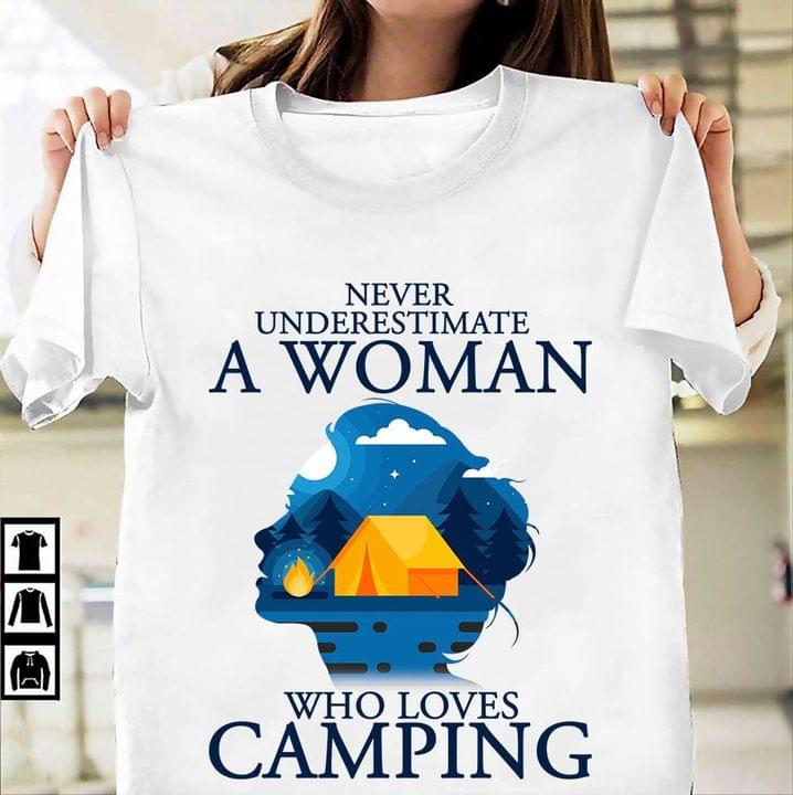 Never Underestimate A Woman Who Loves Camping Lady Girl Landscape Tent Fire Trees Shirt