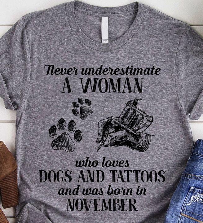 Never Underestimate A Woman Who Loves Dogs And Tattoos And Was Born In November Dog Footprint Tattoo Machine Shirt