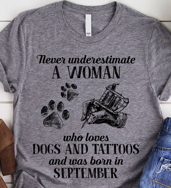 Never Underestimate A Woman Who Loves Dogs And Tattoos And Was Born In September Dog Footprint Tattoo Machine Shirt