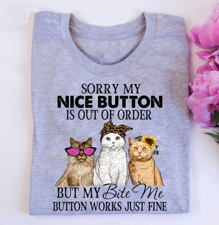 Sorry My Nice Button Is Out Of Order But My Bite Me Button Works Just Fine Cats Wearing Glasses Headband Flower Shirt