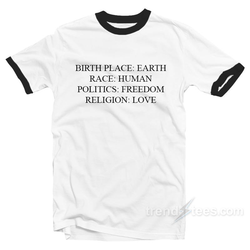 Birthplace Earth Race Human Politics Freedom Religion Love Ringer Shirt