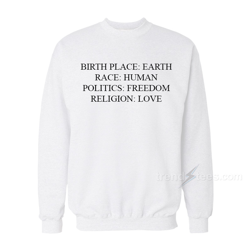 Birthplace Earth Race Human Politics Freedom Religion Love Sweatshirt