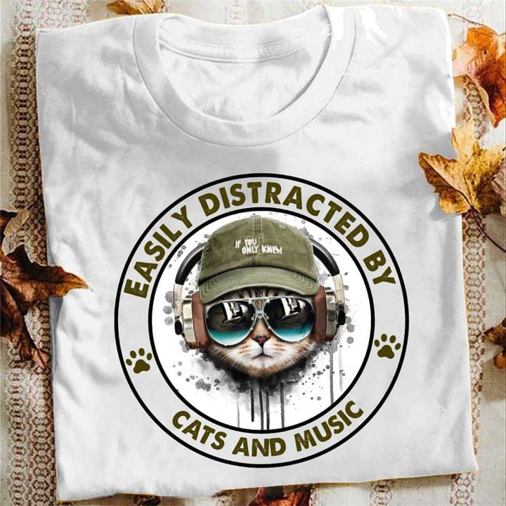 Easily Distracted By Cats And Music Cool Cat Wearing Headphone Glasses Dog Footprint Shirt