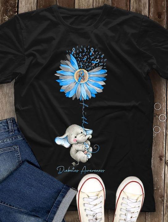 Faith Diabetes Awareness Cute Baby Elephant Blue Ribbons Sunflower Shirt