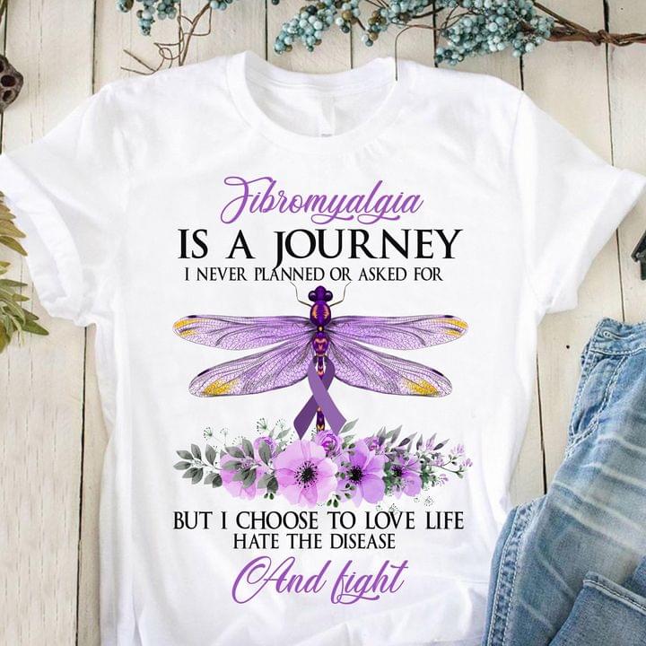 Fibromyalgia Is A Journey I Never Planned Or Asked For But I Choose To Love Life Hate The Disease And Fight Dragonfly And Flowers Shirt