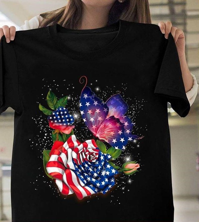 Flag Of America Roses Butterfly Glitters Shirt