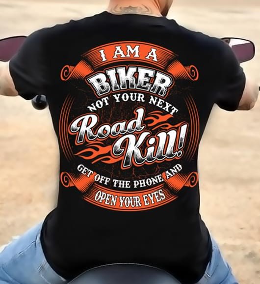 I Am A Biker Not Your Next Road Kill Get Off The Phone And Open Your Eyes Quote Speed Fire Shirt (back Side)