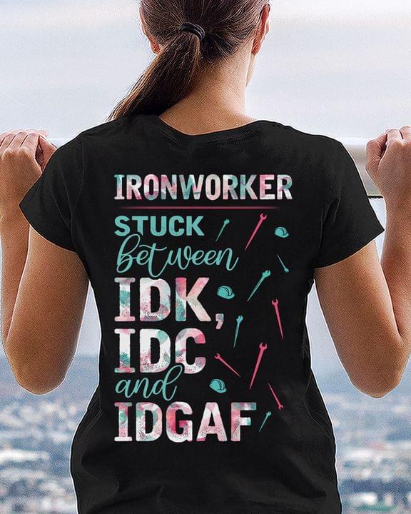 Iron Worker Stuck Between Idk Idc And Idgaf Quote Shirt (back Side)