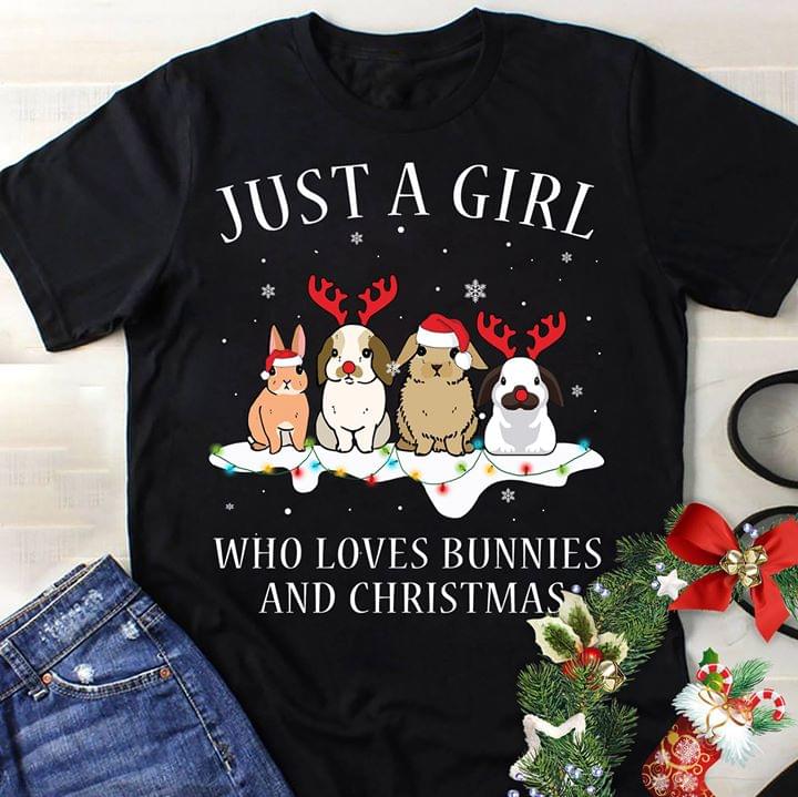 Just A Girl Who Loves Bunnies And Chirstmas Rabbits Wearing Reindeer Headbands Santas Hat Snow Shirt